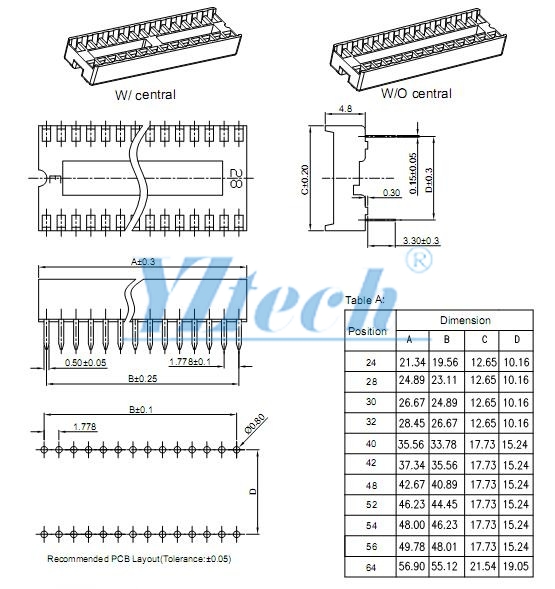 1.778间距 IC SOCKET 宽10.16/15.24/19.05 180度 方P 24P-64P 有杠/无杠